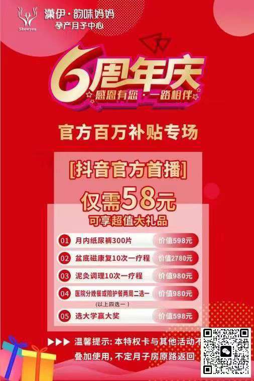 强烈推荐一家#南川潇伊母婴月子会所6️⃣周年庆典,直播间现在99元全新套餐立减3000,仅需5️⃣8️⃣元抢品牌300片纸尿裤及价值千元大礼包🎁(四选一),新🆕孕妈🉑抢,不定月子房可退,名额有限,先到先🉐 联系📞18426537694微信同号