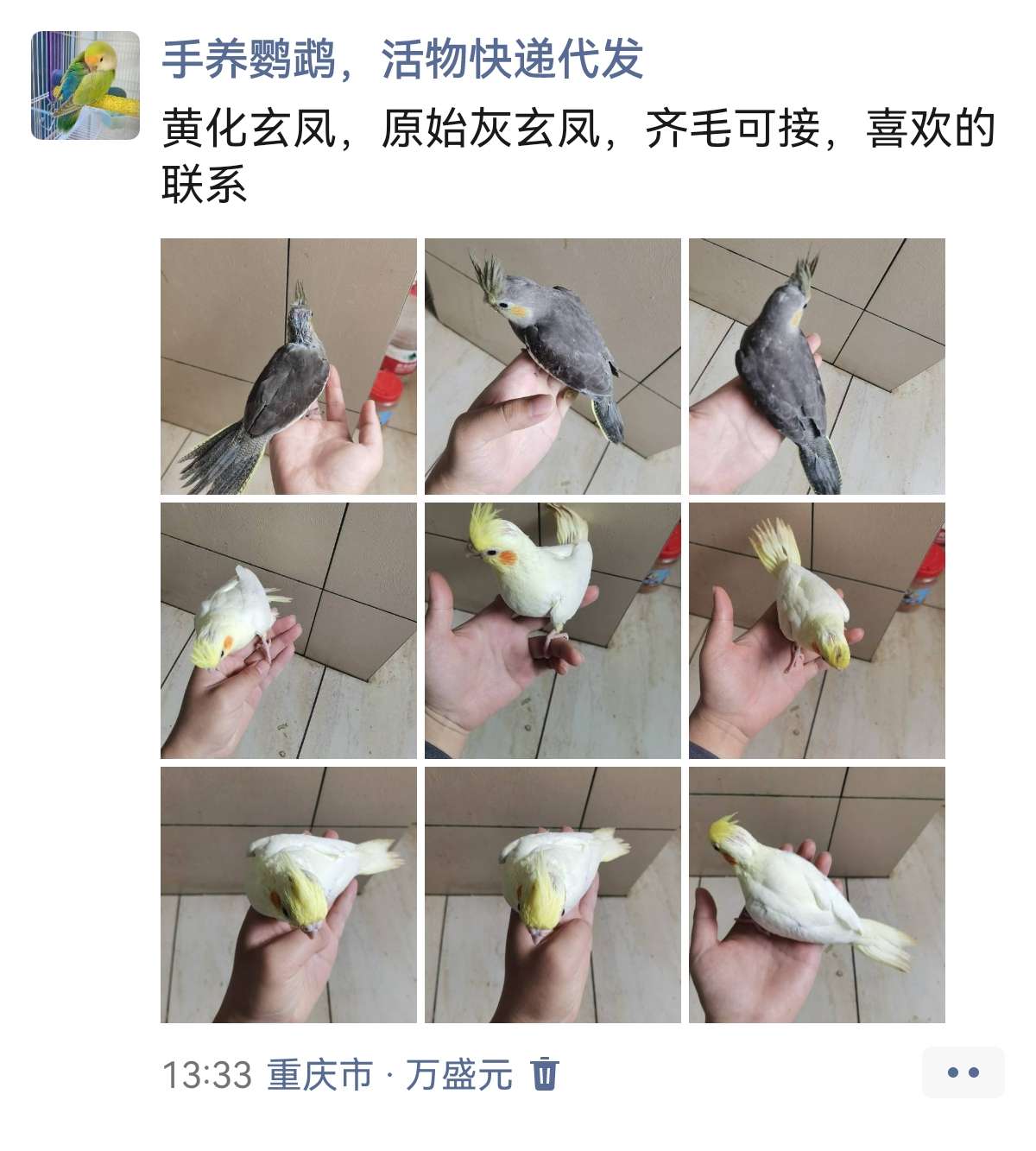 想蹲一只手养乖鹦鹉宝宝的看过来,玄凤有精品不秃黄化,原始灰;11-7 177浏览花鸟鱼虫