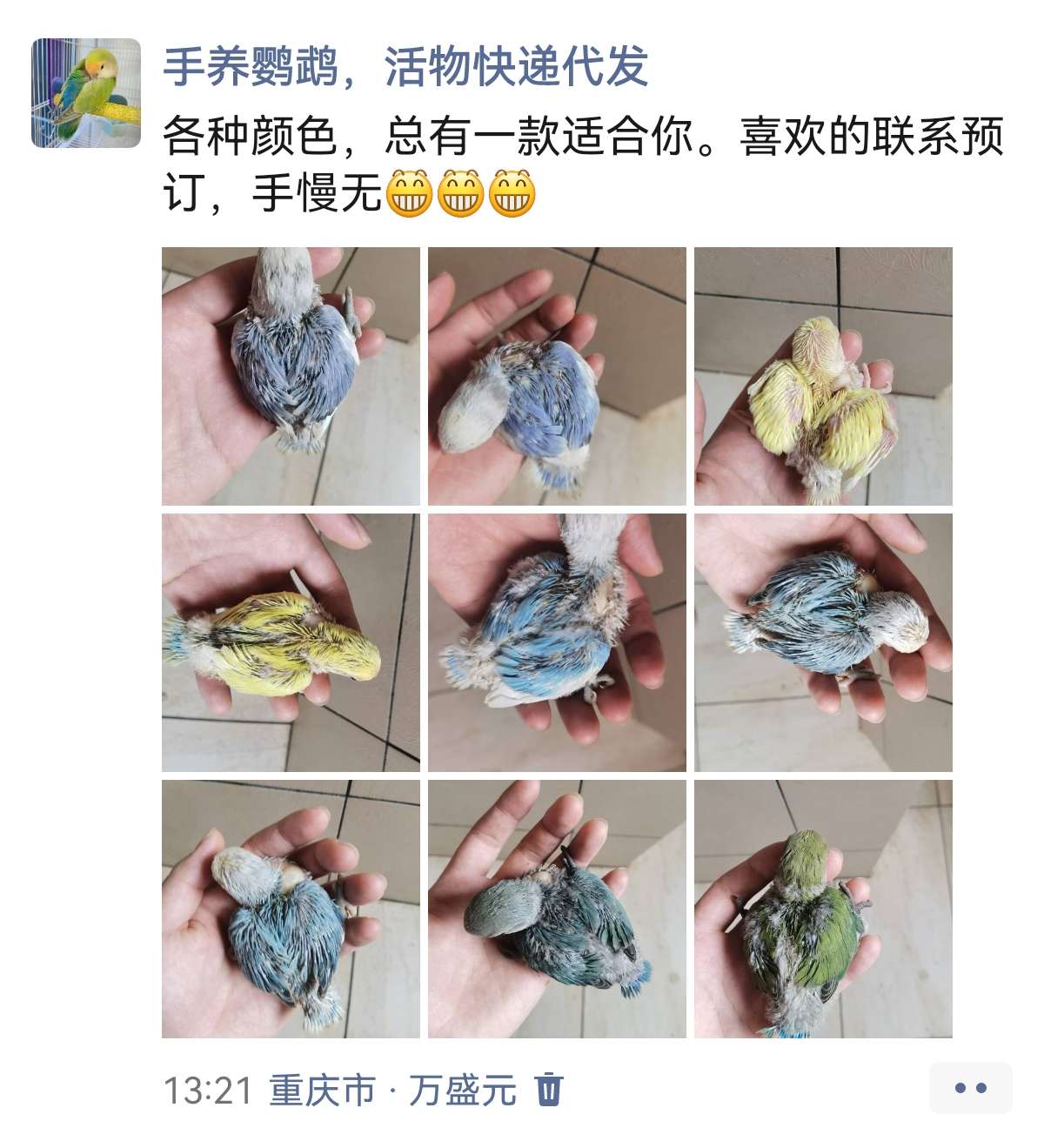 自己家里有3对种鸟正在繁殖,羽色涵盖紫、蓝、松、墨银四种。12-20 290浏览花鸟鱼虫